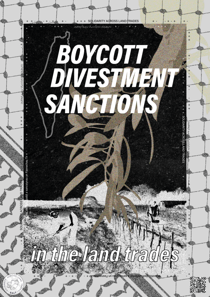 For this reason, we as workers and trade unionists in the land-trades sector are calling for total boycott, divestment and sanctions (BDS) of Israel in support of the Palestinian resistance movement. SALT has developed a list of targets in our industries who are in different ways complicit with Israel’s genocide and calls on all land workers to adhere to the BDS of these targets and organise their workplaces to do the same.