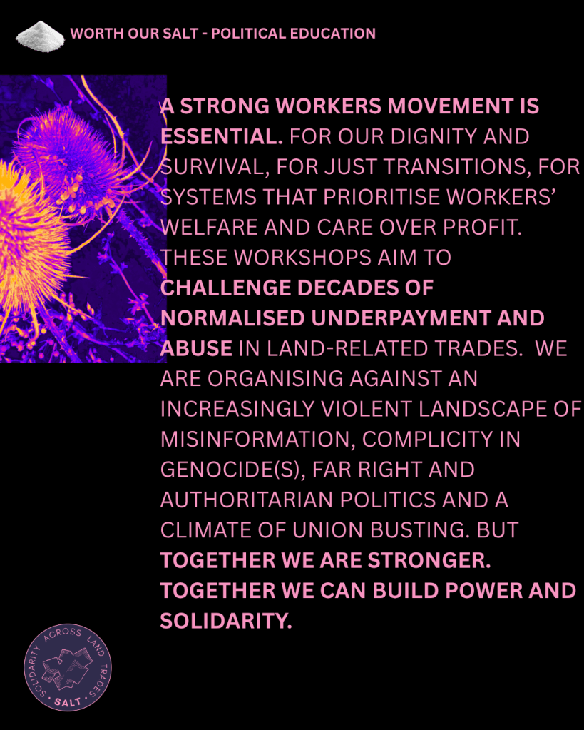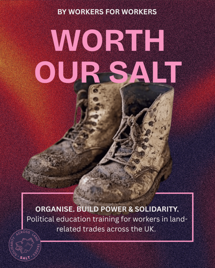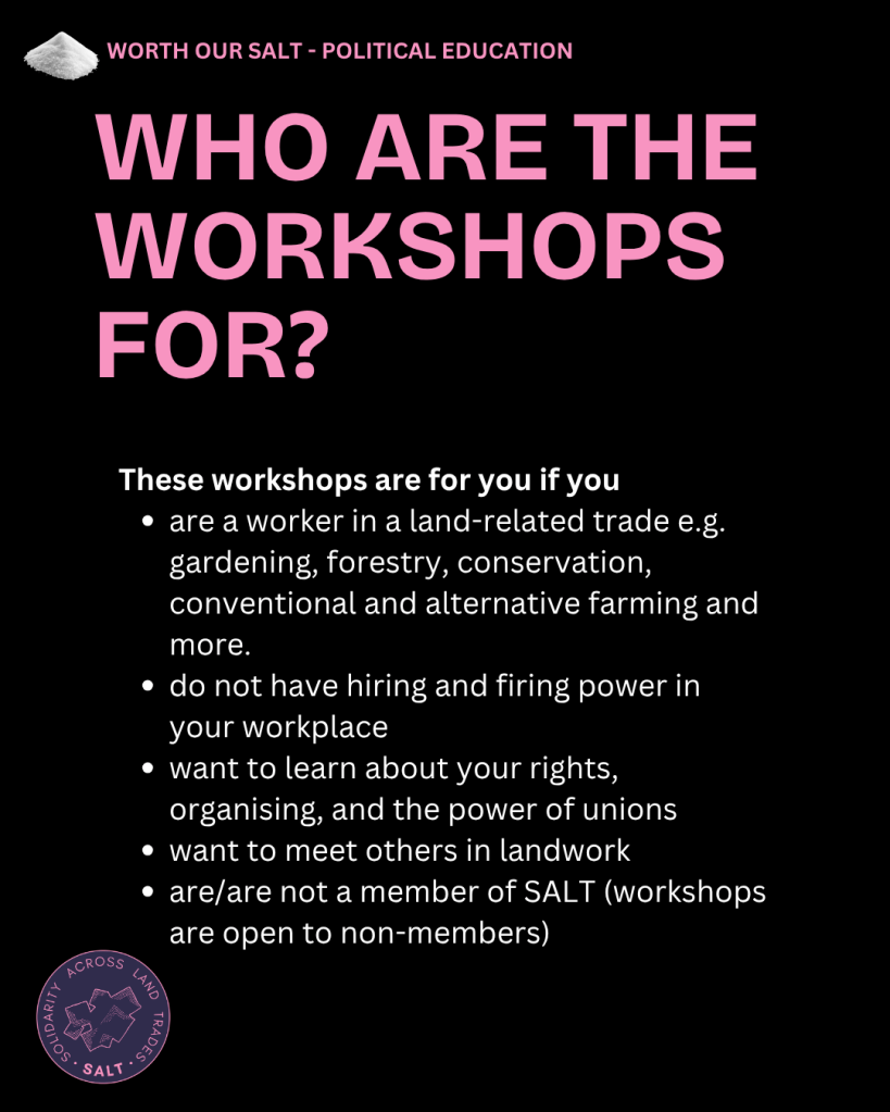 Solidarity Across Land Trades (SALT) is offering a series of political education workshops for workers! Join one of our sessions across the UK to learn about your rights, feel empowered to organise in land-related trades and connect with fellow workers.